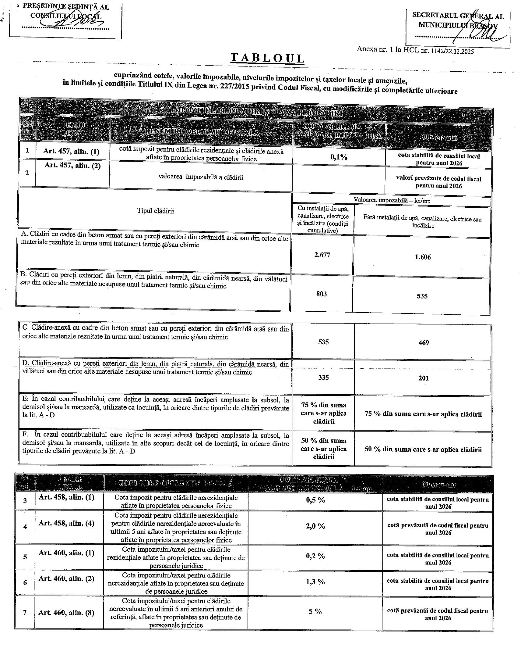 In Hotararea nr. 1142/2025 a Consiliului Local Brasov s-au stabilit urmatoarele cote de impozitare care se aplica la valoarea impozabila a cladirii: