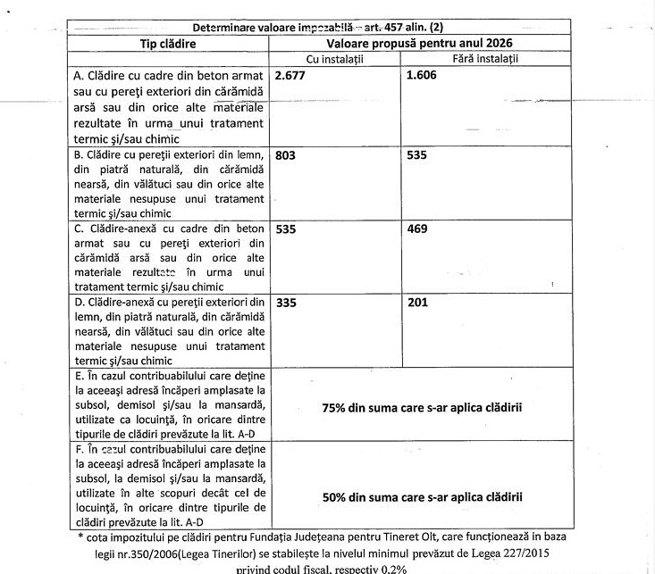 Impozitul pe cladiri se calculeaza prin aplicarea unei cote de impozitare stabilite de Consiliul Local Slatina asupra valorii impozabile a cladirii. Valoarea impozabila pentru anul 2026 este urmatoarea: