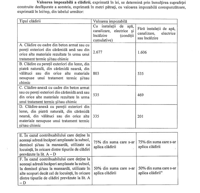1. Impozitul pe cladiri creste ca urmare a modificarii valorii impozabile. Conform noii legi, valoarea impozabila a cladirilor creste (se modifica tabelul prevazut la alin 2. la art. 457 din Codul Fiscal). Impozitul se va calcula in continuare prin inmultirea suprafetei locuintei cu valoarea impozabila si cu cota de impozitare de 0,08% - 0,2% stabilita de Consiliile locale.