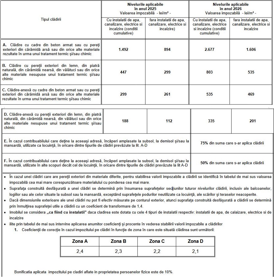 Asupra valorilor stabilite prin tabelul de mai sus intervine aplicarea anumitor coeficienti si procente in vederea stabilirii valorii impozabile a cladirilor.