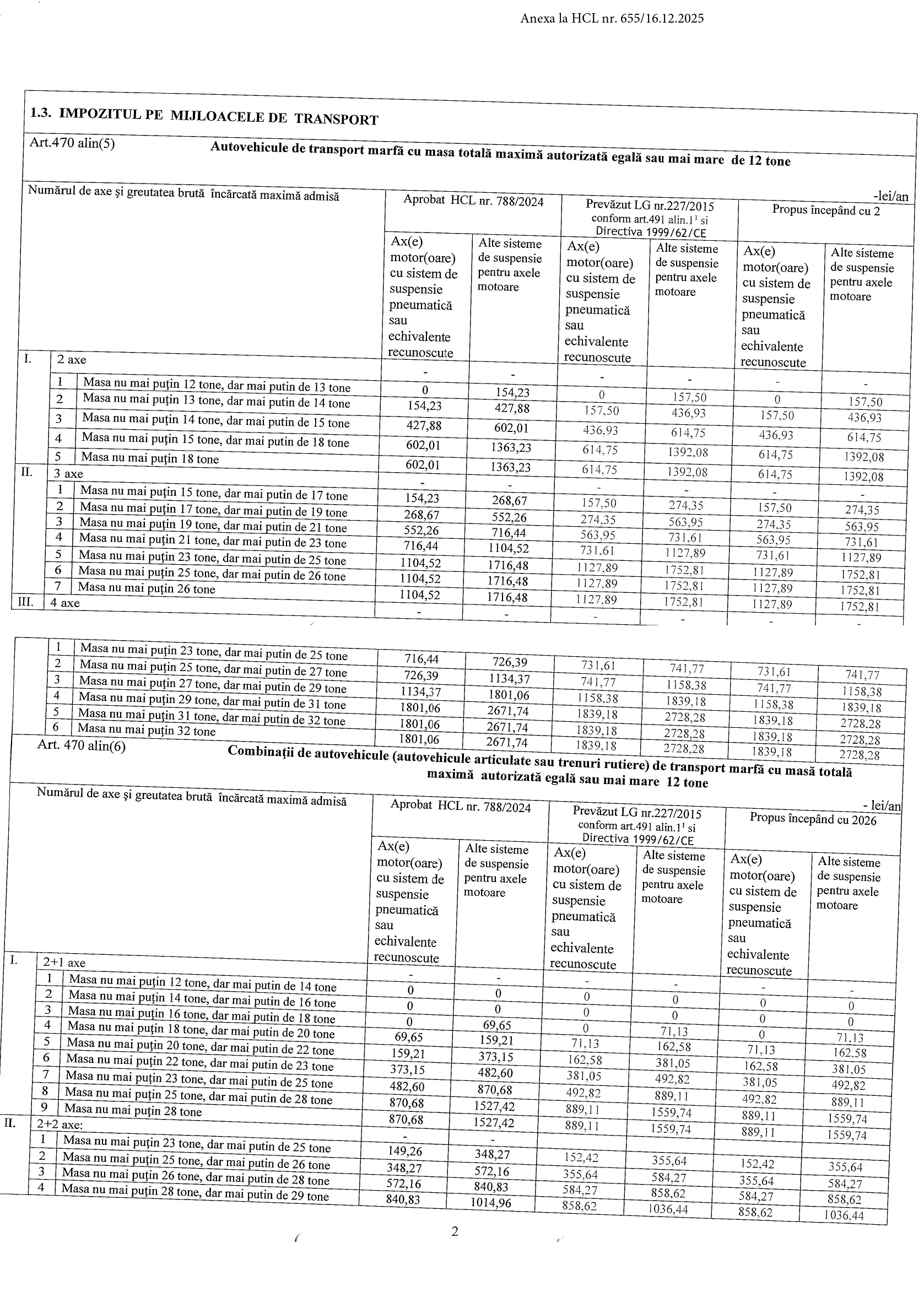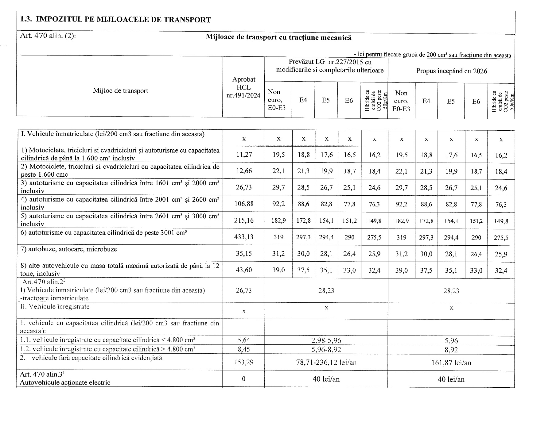 Taxele si impozitele pentru mijloacele de transport cu tractiune mecanica a fost stabilita in functie de capacitatea cilindrica a mijloacelor de transport si norma de poluare. Iata un extras din HCL 650/2025 cu aceste obligatii fiscale: