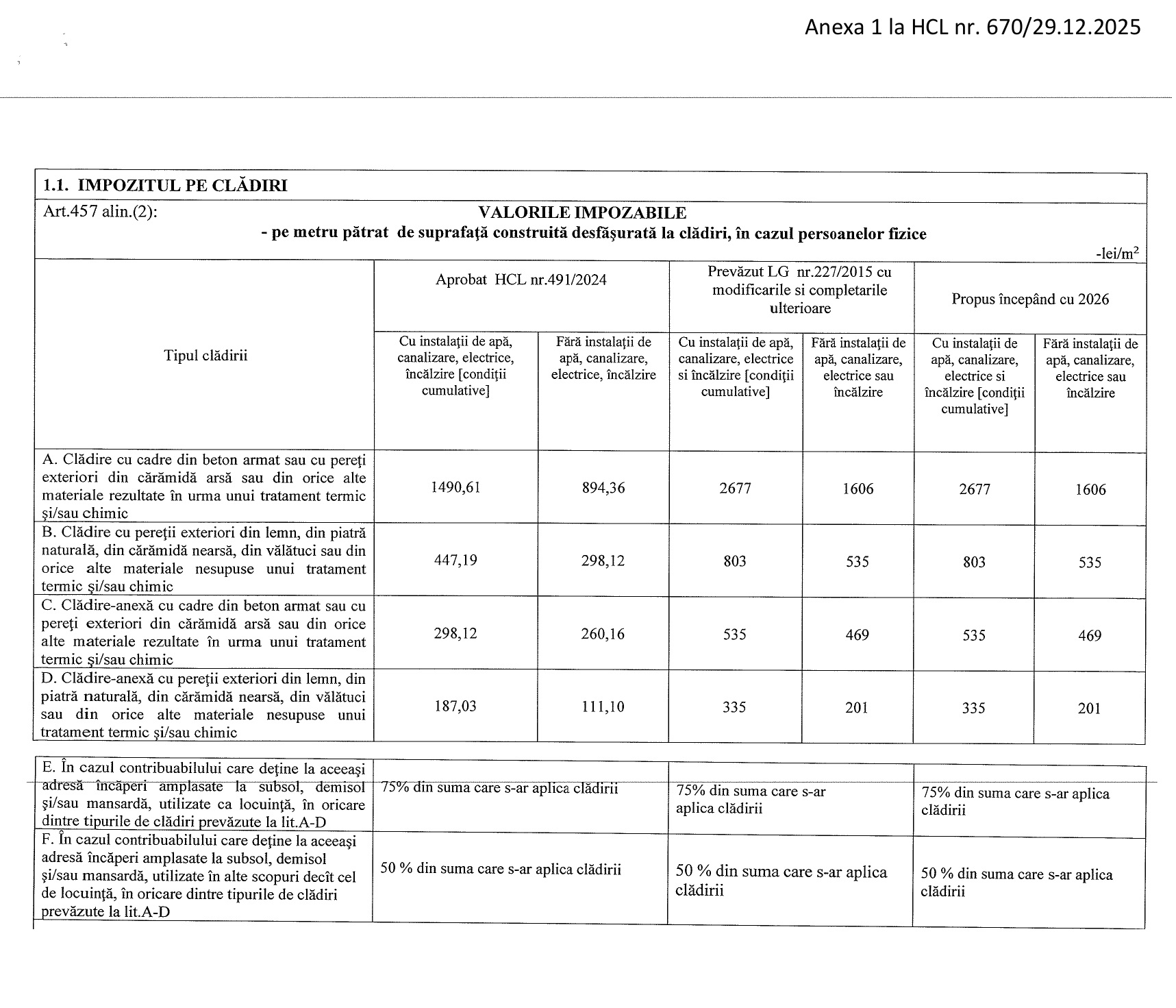 Incepand cu 2026, a crescut valoarea impozabila a cladirilor asupra careia se aplica cotele de impozitare de mai sus. Conform prevederilor