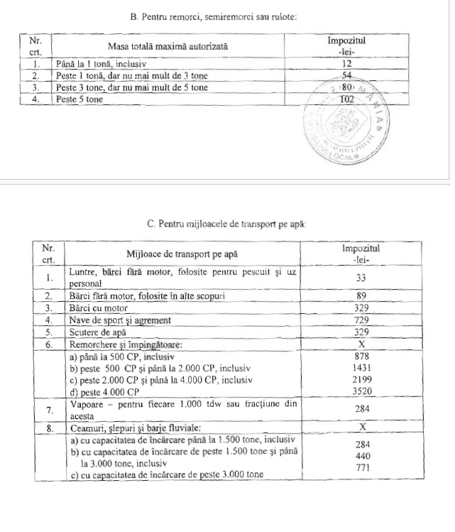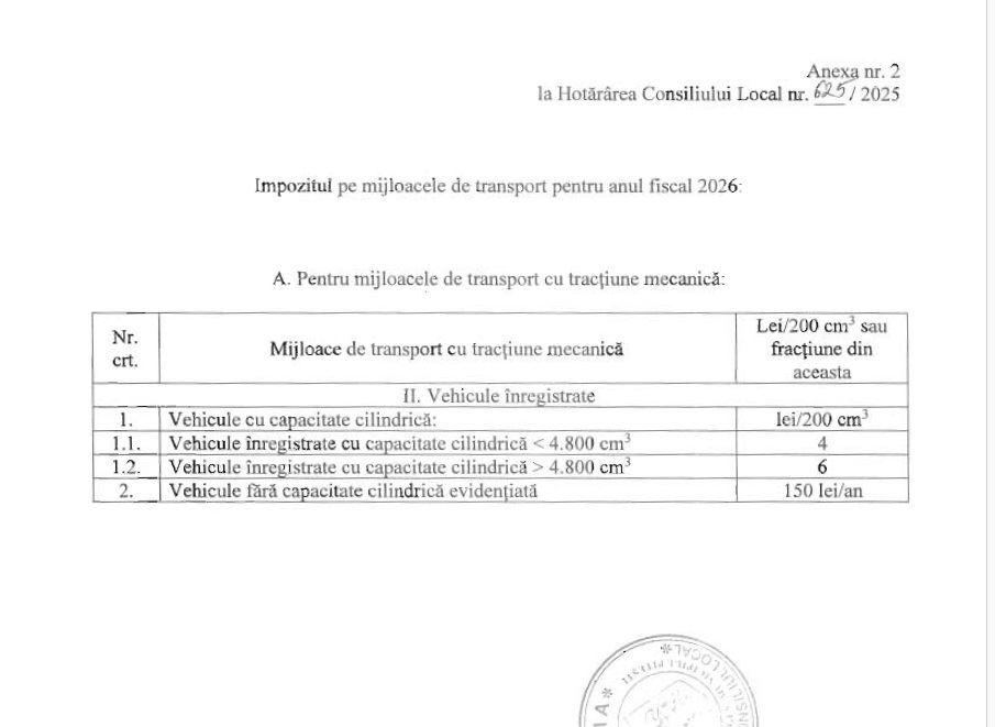 Pentru celelalte tipuri de mijloace de transport, raman valabile impozitele stabilite in HCL 180/2025, si anume: